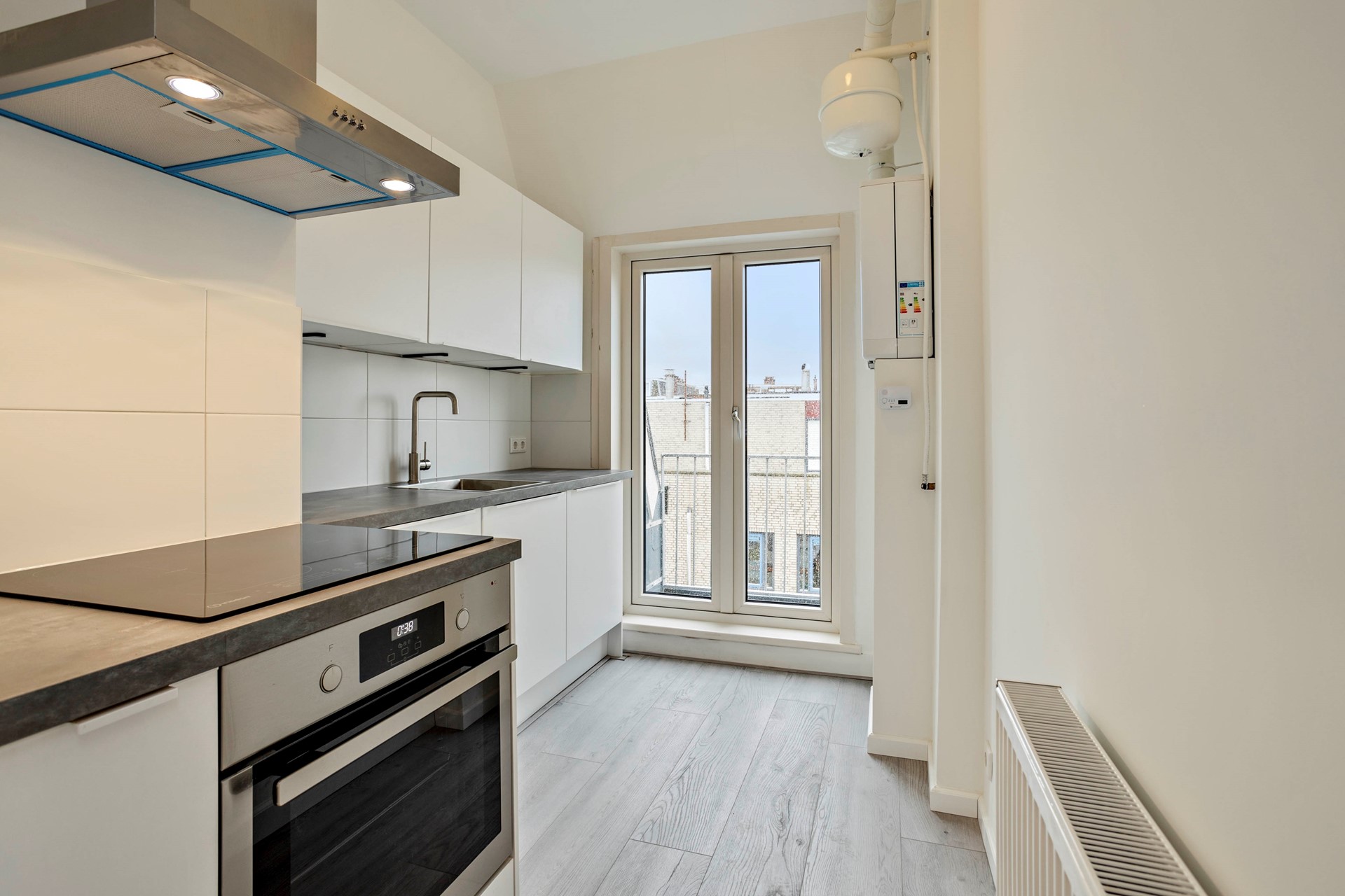 - Nieuw kunststof kozijn met HR+ glas gelegen aan de achterzijde (keuken) met dubbele deuren naar balkon.