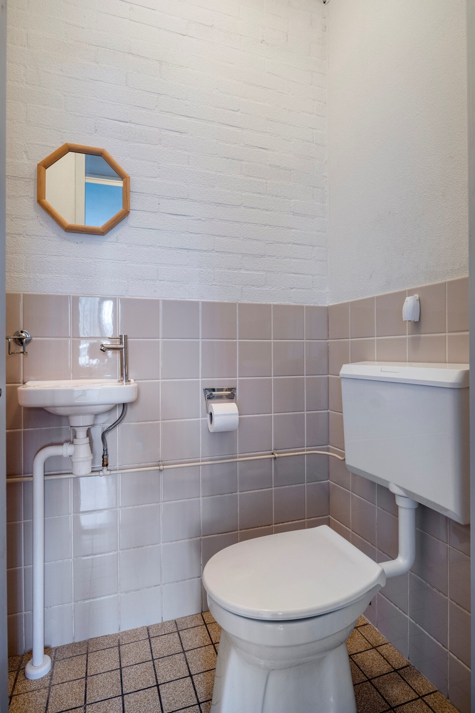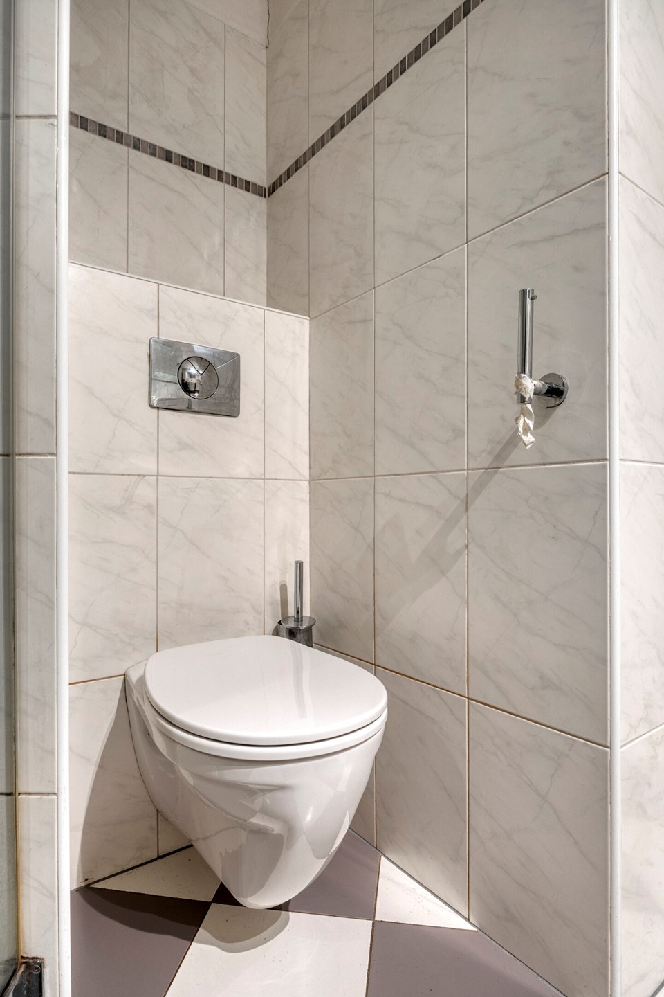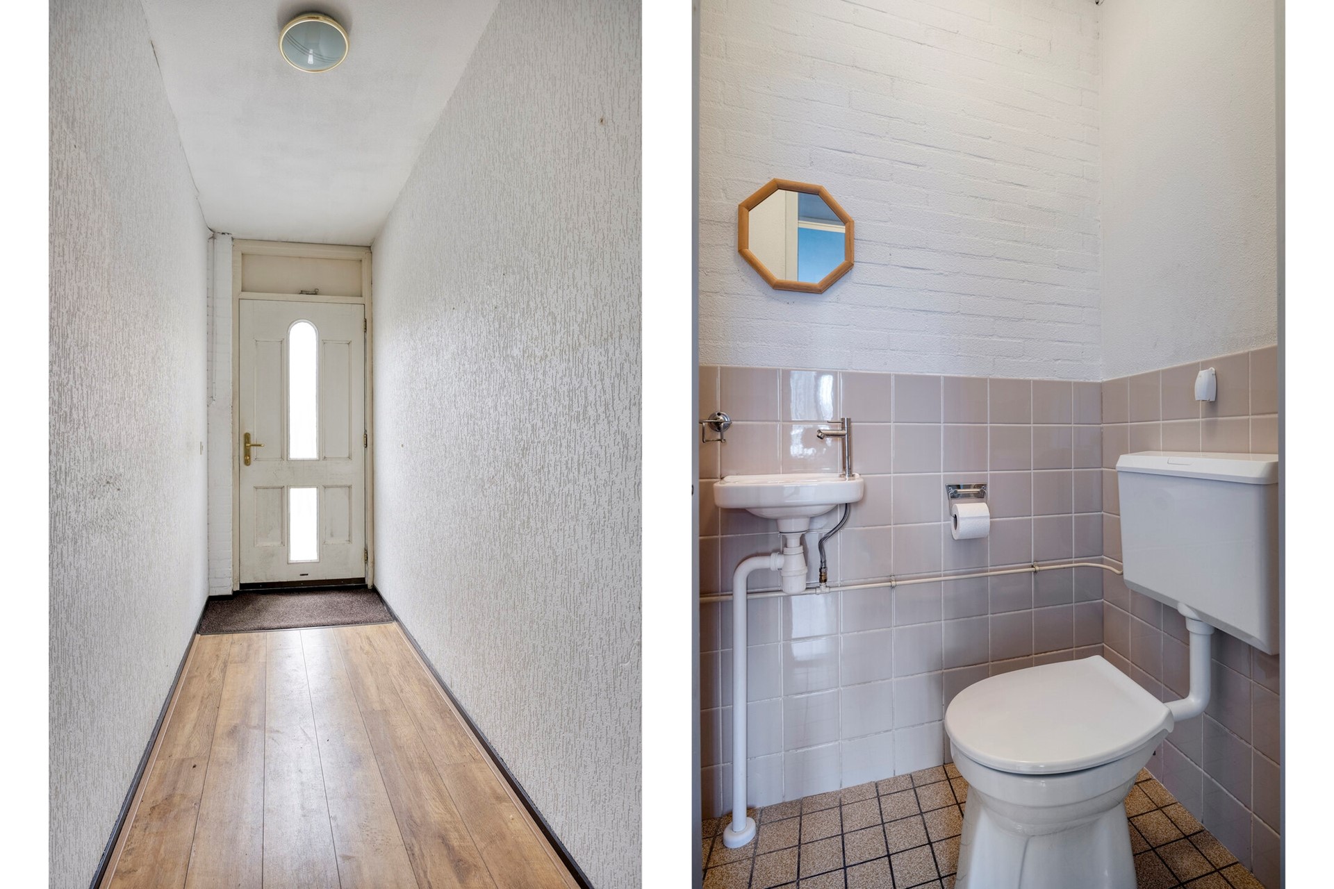 Entree op straat niveau, entree appartement, gang met meterkast, toilet met fontein en 1e slaapkamer gelegen aan de voorzijde, trapopgang naar de 2e woonlaag