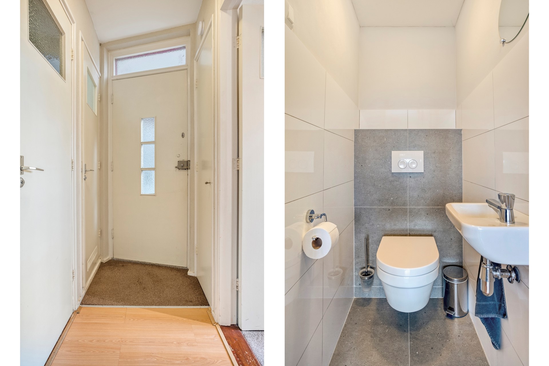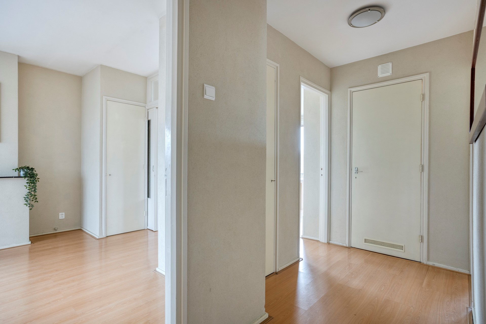Entree appartement. Hal met meterkast en vaste kast. De royale hal biedt toegang tot alle vertrekken, waaronder een modern toilet met fontein. De zeer lichte woonkamer met toegang middels een schuifdeur tot de naastgelegen eetkamer is voorzien grote raampartijen en biedt prachtig uitzicht over de groene kade.