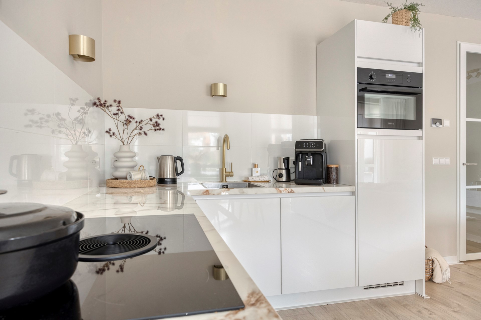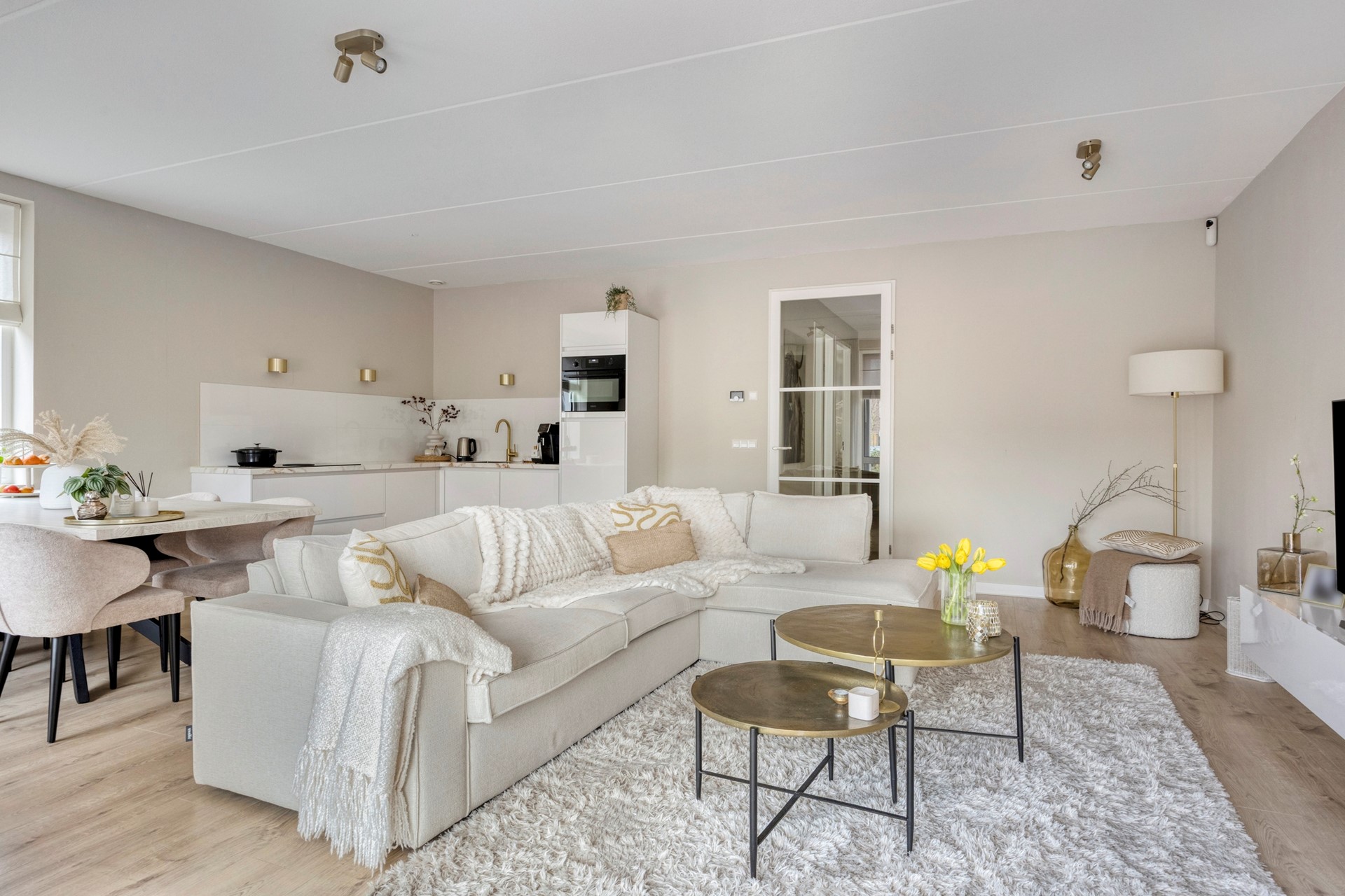- Woonkamer met luxe open keuken voorzien van Bora inductiekookplaat met geïntegreerde afzuiging, vaatwasser en koel-/vriescombinatie