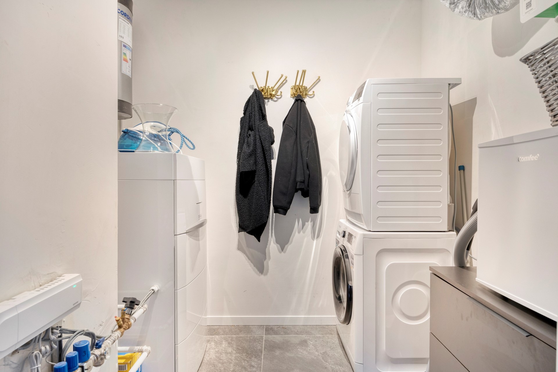 - Warm water en verwarming: luchtwarmte-pomp met vloerwarming en een elektrische boiler voor het warme water